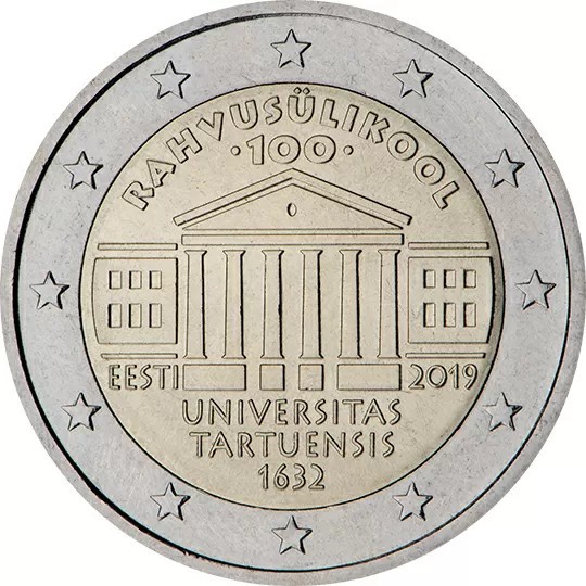 University of Tartu as being established as the first Estonian language university. It was founded in 1632 by Swedish King Gustav II Adolf and is one of the oldest universities in northern and eastern Europe. In 1919 it became the first Estonian language university. The design depicts a motif of the main building of the university. It also bears the inscriptions ‘RAHVUSÜLIKOOL 100’ (National University 100) and ‘UNIVERSITAS TARTUENSIS’, the year ‘1632’, the issuing country and the year of issue. The coin’s outer ring bears the 12 stars of the European flag.