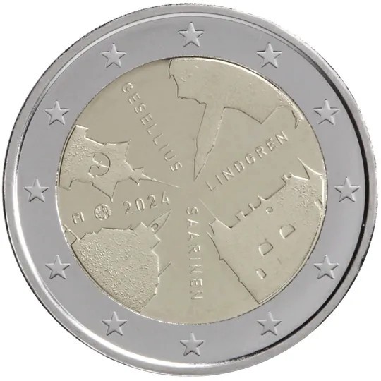 Silhouettes of four buildings. The roof towers of the buildings point towards the centre. The texts ‘GESELLIUS’, ‘LINDGREN’, ‘SAARINEN’ and the indication of the issuing country ‘FI’, the mintmark and the year of issue run diagonally between the buildings. The texts and the silhouettes of the buildings form a clock-like composition on the circular image surface of the coin. The coin’s outer ring bears the 12 stars of the European flag.