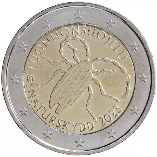 Stylized beetle. On the top in semi-circle is the lettering ‘NATURE CONSERVATION’ in Finnish and at the bottom in semi-circle are the lettering ‘NATURE CONSERVATION’ in Swedish and the year of issue. The right-hand side of the inner part of the coin bears the lettering ‘FI’. The left-hand side of the inner part of the coin bears the mintmark of the Mint of Finland. The coin’s outer ring bears the 12 stars of the European flag.