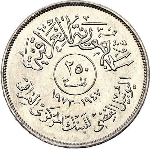 Value in Arabic in a central circle with lettering, the country name above. The inscription "Silver Jubilee of the Central Bank of Iraq" below and the date above it (1947-1972).