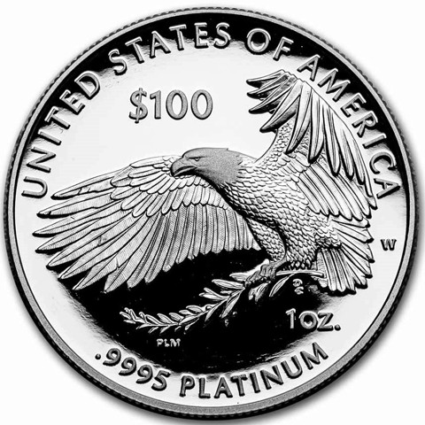 The common reverse design for coins in this series depicts an eagle in flight with an olive branch in its talons. Inscriptions are "UNITED STATES OF AMERICA," "$100," "1 OZ.," and ".9995 PLATINUM."