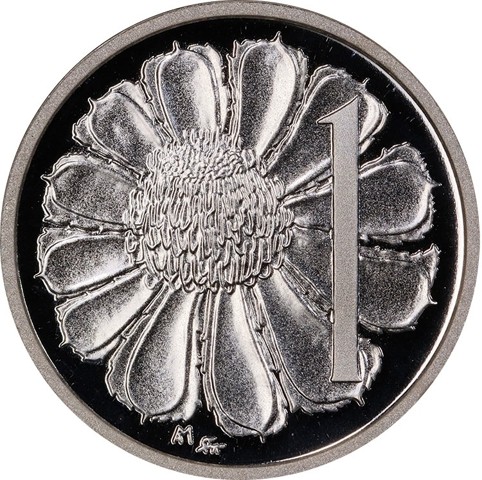 Waratah (Telopea speciosissima), the floral emblem of New South Wales, is illustrated in the middle. Superimposing the flower at the right side is a large numeral "1", which represents the face value of 1 cent. Andor Mészáros' signature is included in small print below the waratah, near the bottom of the piece.