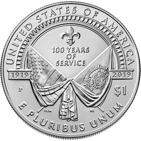 The reverse design represents the founding of the American Legion in Paris in 1919. Above the crossed American and American Legion flags is a fleur de lis and the inscription “100 Years of Service.”