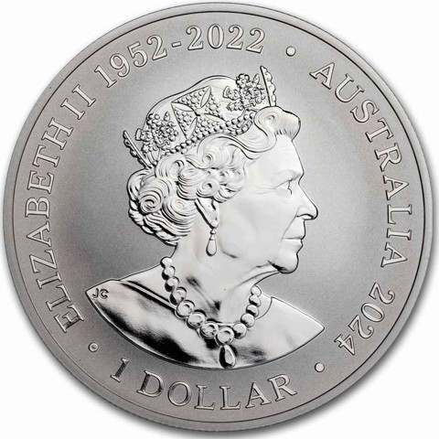 6th crowned portrait of HM Queen Elizabeth II facing right (the Commonwealth effigy), wearing the George IV State Diadem, the Coronation Necklace and Earrings framed by inscriptions “ELIZABETH II,” "the dates of the Queen's reign 1952 - 2022, AUSTRALIA, 2024” and the face value “1 DOLLAR.”