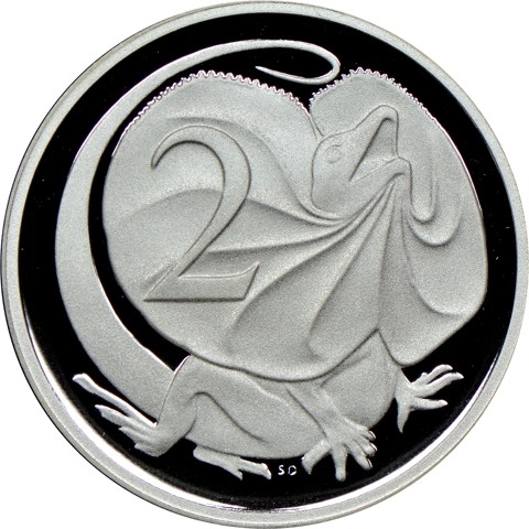 The reverse features a frilled-neck lizard with neck frill extended and mouth open, designed and sculpted by Stuart Devlin. The denomination numeral 2 [cents] is left of the lizard's head; below its body in tiny letters initials of designer (SD).
