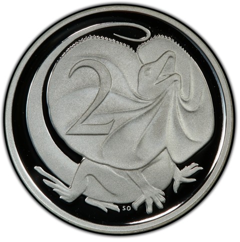 The reverse features a frilled-neck lizard with neck frill extended and mouth open, designed and sculpted by Stuart Devlin. The denomination numeral 2 [cents] is left of the lizard's head; below its body in tiny letters initials of designer (SD).